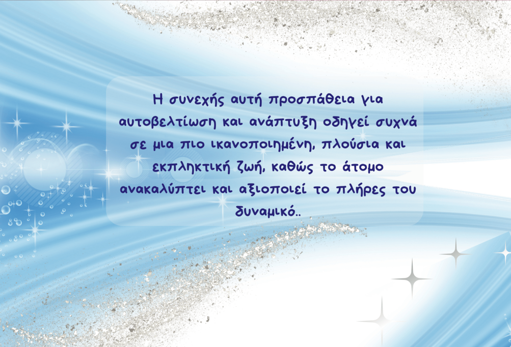 Η συνεχής αυτή προσπάθεια για αυτοβελτίωση και ανάπτυξη οδηγεί συχνά σε μια πιο ικανοποιημένη, πλούσια και εκπληκτική ζωή, καθώς το άτομο ανακαλύπτει και αξιοποιεί το πλήρες του δυναμικό.